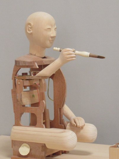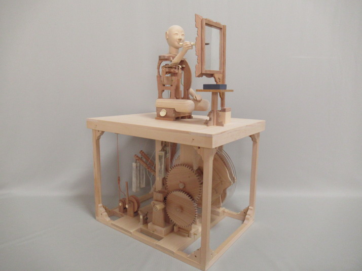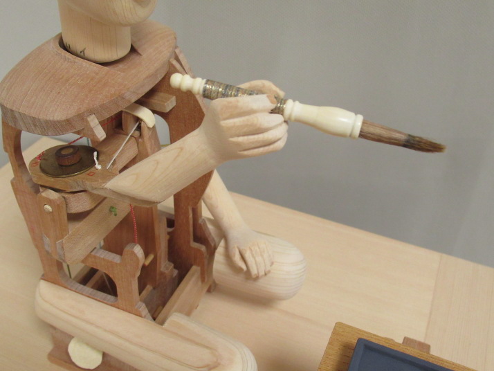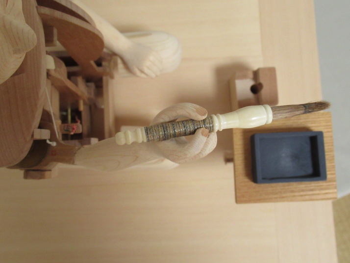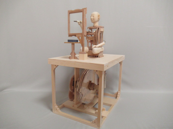 田中久重(1799-1881)が作った文字書き人形は、筆運びも滑らかに達筆な文字を書きますが、 そのからくりの構造の中味を見る機会はほとんどありません。 からくり人形の最高傑作と評価されるだけあって、スタート釦を押すと、筆が動き始め、硯から 離れて文字を書き、書き終わると硯に戻り止まるという一連の動きは素晴らしいものです。 いわゆるプログラミングされたロボットそのものです。 その一端でも見てもらえるように、機構の一部(糸からくり部分)に焦点をあてスケルトン模型を 作ります。 ぜんまい、ぜんまい巻き取り機構、調速機、画板自動回転機構、腕木自動巻き上げ機構、カム 切換装置等は省略します。 カム軸は、ぜんまいの代わりに、カム軸回転把手(ハンドル)を手動で回して回転させます。 ハンドルを36回回すと、カム軸が1回転します。(1文字を書くことになります) 右手(筆先)が、カム、腕木、糸を伝って動く様子が分かるように作られています。 カムに入力された三次元情報を腕木が読み取り、筆先が空間にある座標(X,Y,Z)をなぞります。 ハンドルを回したり、止めたりしながら解説出来ます。 それでは、頭から作って行きます。 2024.2.14 頭製作 筆先を目で追っているような動きです。 そのため造りが他のからくり人形の頭と少し違います。 首の底が半円球の形をしています。 このページ、トップへ 2024.2.28 人形骨格 すべての部品を木工用ボンドで貼り合わせます。 胴内の空間に右手前後用腕木機構が組み立てられます。 機構が右胴からはみ出すため、右胴が大きく開いています。 左胴、中胴、右胴の四角のくり抜きは、機構の動き、糸の動きをより多く見てもらうための 模型用仕様です。 このページ、トップへ 2024.3.9 人形前後用腕木機構 部品を組み立てていき、最後に人形骨格に組み立てます。 これで人形の右手(筆)を左右、上下、前後に動かす準備が出来ました。 まだ左右両手、筆が有りません。 右手、筆は、人形を天板に座らせ、画板を組み立ててから、実物に合わせ貼り合わせます。 このページ、トップへ 2024.3.19 天板 飾り枠や機構の多くを省略しているので、実作品より幅、奥行きを小さくしています。 巻き上げ滑車受けや画板受けなどの部品を貼り合わせています。 糸切れ防止の糸ガイドも貼り合わせています。 人形の糸を通す時は、交差させる左右位置や目釘の前後位置等に十分配慮して、糸を通します。 このページ、トップへ 2024.3.27 画板・机 角あわせが平面ではなく立体となるので、ピタッと合わせる加工は大変難しいです。 大きさと直角はしっかり出して、他はかなり修正を加えています。 実物の画板の動きは、書き始めと、書き終わりにそれぞれ自動で180度回転します。 模型は、自動回転機構を省略していますので、解説時、適時、手動で回転させます。 このページ、トップへ 2024.4.6 機構枠